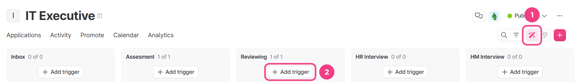 Head over to one of your jobs on Teamtailor. From the applications view, you should click on Triggers (1).