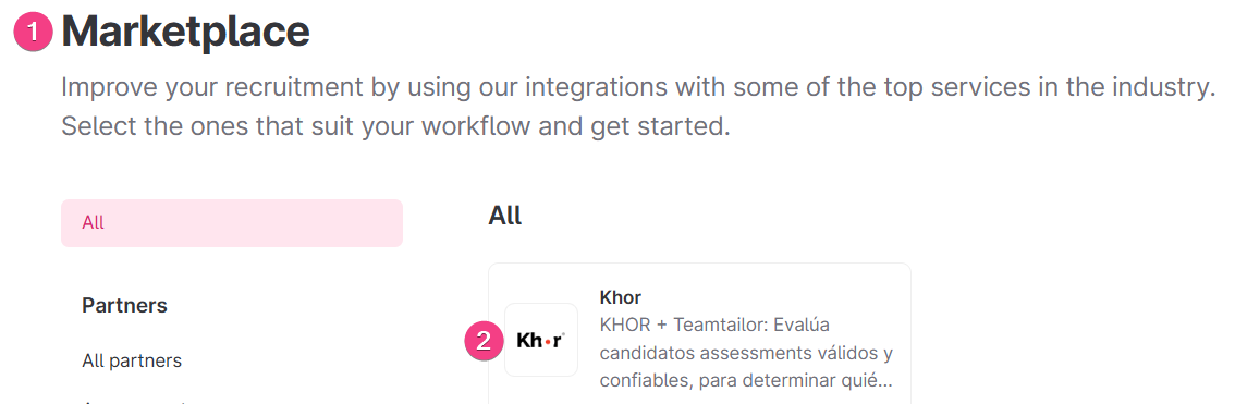 Once you have an agreement with us, go to Teamtailor's Marketplace (1), and select Khor integration (2).