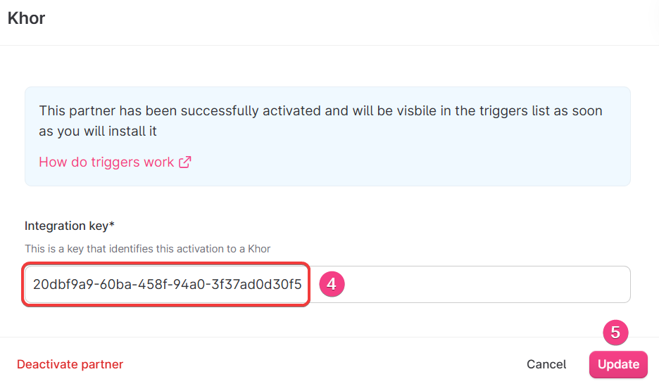 And Activate (3) the integration to get an Integration key (4). Copy the key and send it to soporte@iucorporation.com or to your sales representative to complete de activation in Khor. Don't forget to click on the Update button (5) to save the activation key on Teamtailor