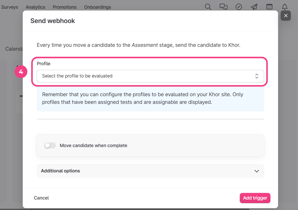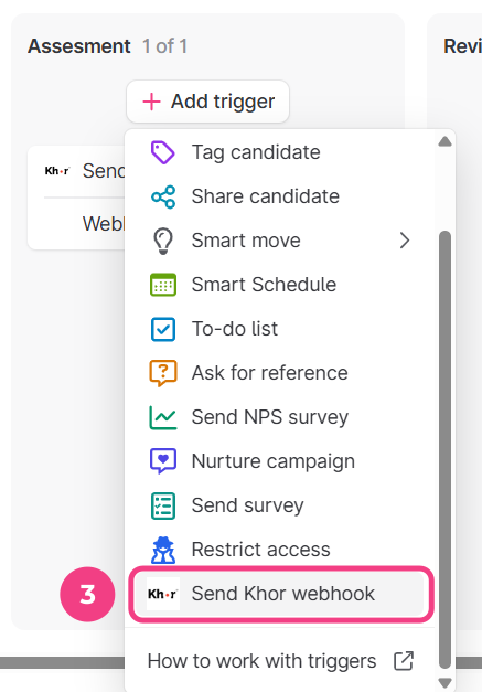 Then select the stage where the candidates will receive an invitation to apply for the assessments and click on the “Add trigger” (2) button and scroll down until you find the option “Send Khor webhook” (3)