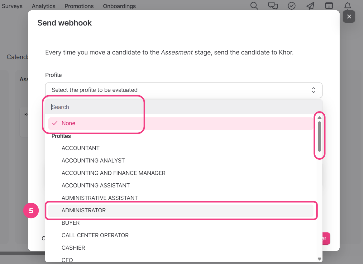 A form will open where you can select the profile you want to use to evaluate candidates for this position. Click on “Select the profile to be evaluated” (4) to see the profiles available.