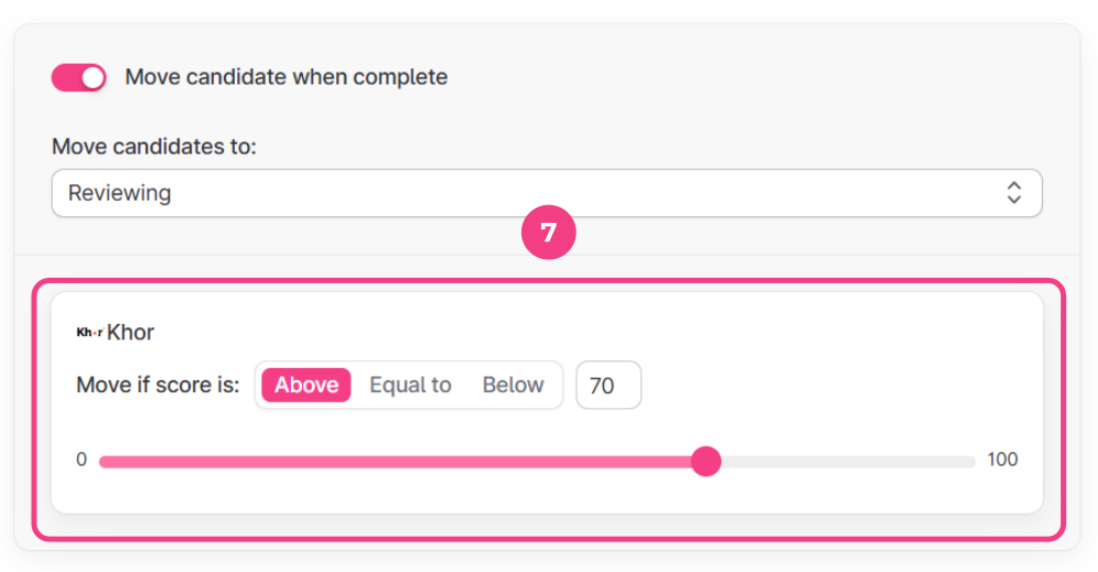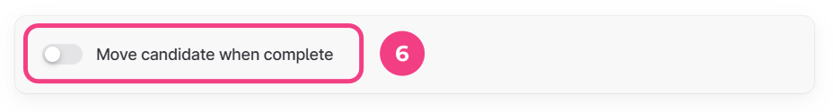 Optionally, you can set up how Teamtailor reacts to the score (compatibility) of the candidate. Click on “Move candidate when complete” (6) to see the options available.
