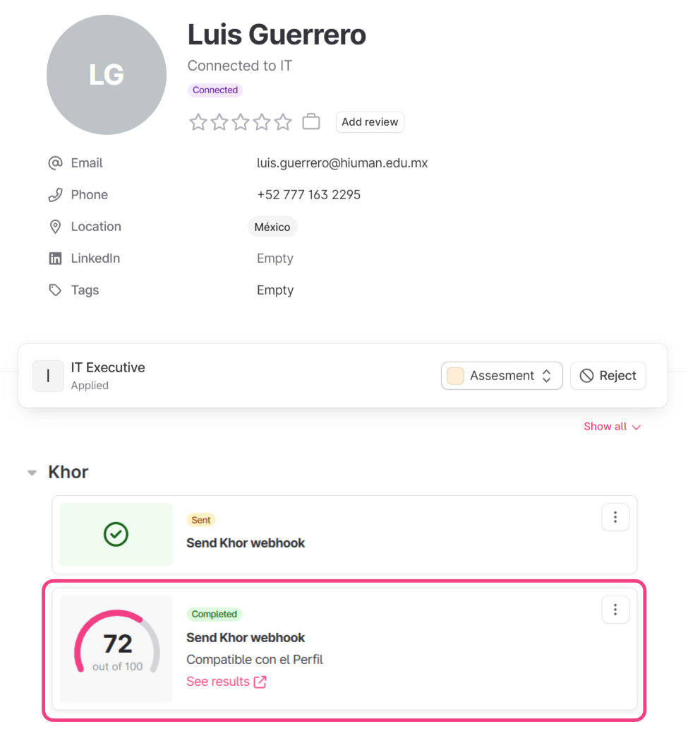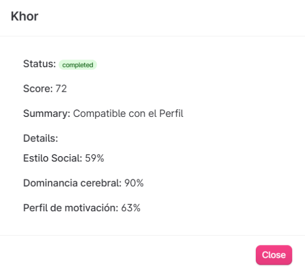 Khor score is the compatibility percentage of the candidate versus the profile. You can advance the candidate to another stage based on its score. (7)